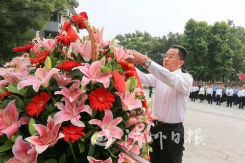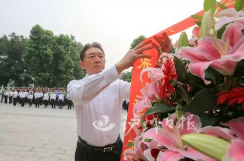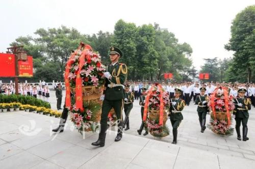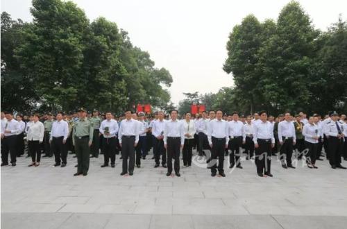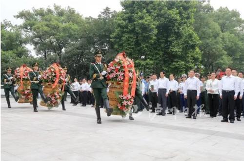 刘强、杨林兴、曹建国、田亚东等缓步登上台阶,仔细整理花篮上的缎带,并和各界代表依次走向烈士纪念碑,深情瞻仰,向革命烈士表达最崇高的敬意。